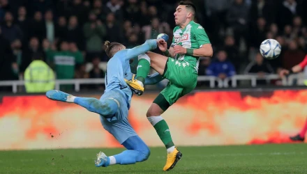 Ο τερματοφύλακας του ΠΑΟΚ δέχθηκε μια... καρατιά από τον Χρήστο Δώνη στο 56ο λεπτό του αγώνα που βρήκε νικητή τον Δικέφαλο με 1-0 επί του Παναθηναϊκού και με το εισιτήριο για τα ημιτελικά του Κυπέλλου.