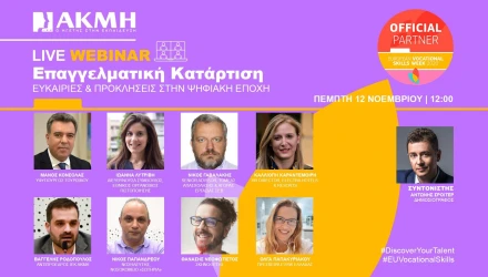 Στο πλαίσιο της συμμετοχής του ΙΕΚ ΑΚΜΗ στην Ευρωπαϊκή Εβδομάδα Επαγγελματικών Δεξιοτήτων με την ιδιότητα του επίσημου εθνικού υποστηρικτή, το μεγαλύτερο ΙΕΚ της χώρας θα πραγματοποιήσει την Πέμπτη 12 Νοεμβρίου στις 12:00 διαδικτυακή ημερίδα (live webinar) με αντικείμενο τις νέες προκλήσεις στον χώρο της επαγγελματικής κατάρτισης στην Ελλάδα.