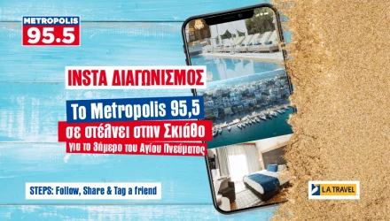 Κάνε follow την σελίδα του σταθμού στο instagram ,share και tag a friend , μπες στην κλήρωση και κέρδισε ένα μοναδικό τριήμερο στην Σκιάθο με δωρεάν διαμονή στο 5άστερο la piscine και δωρεάν μεταφορικά