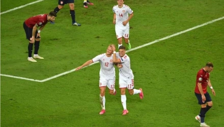 Οι Δανοί ξεκίνησαν με τον καλύτερο τρόπο αφού στο 5ο λεπτό ο Ντιλέινι βρέθηκε μόνος του στην περιοχή των Τσέχων και με κεφαλιά άνοιξε το σκορ.