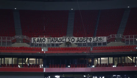 Το πανό φέρει τη συγκινητική επιγραφή: «Καλό παράδεισο αδέρφια», αποδίδοντας φόρο τιμής στους επτά φιλάθλους και εκφράζοντας τον σεβασμό και τη βαθιά θλίψη της ομάδας και των οπαδών.