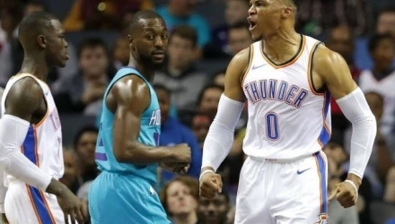 Αυτός που έκελεψε την παράσταση ήταν ο Ράσελ Ουέστμπρουκ που βρίσκεται στο Νο 4 με ένα τρομερό κάρφωμα και στην κορυφή με ένα απίθανό σόλο που διέλυσε την άμυνα των Χόρνετς.