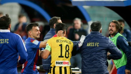 Κατά τη διάρκεια της έντασης στις κερκίδες στην αναμέτρηση του ΝΠΣ Βόλος-Άρης ακολούθησαν συμπλοκές μεταξύ των ποδοσφαιριστών στον αγωνιστικό χώρο.