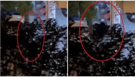 Αυτό είναι τραβηγμένο από ένα μπαλκόνι σπιτιού της περιοχής και δείχνει έναν νεαρό, ο οποίος έχει εγκλωβιστεί από αστυνομικούς, με την πλάτη σε ένα παρκαρισμένο αυτοκίνητο, να δέχεται τα συνεχόμενα με κλωτσιές και μπουνιές.