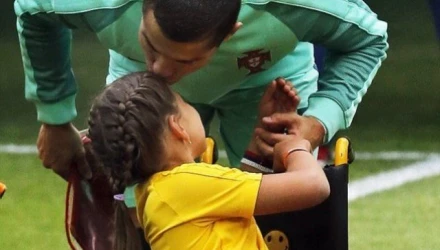Ωστόσο, όλα τα λεφτά ήταν το... εξωαγωνιστικό του γκολ. Συγκεκριμένα, κατά την είσοδο των δύο ομάδων, ο Πορτογάλος άσος συνοδευόταν από ένα κοριτσάκι που βρισκόταν σε καρότσι εξ' αιτίας σοβαρού κινητικού προβλήματος.