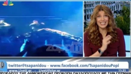 Φωτογραφίες και αποσπάσματα από τη βραδιά έφτασαν και στο «Live U» της Πόπης Τσαπανίδου με τη δημοσιογράφο να ζητά να χαμηλώσουν τη φωνή από το βίντεο ...μην τυχόν και το ακούσουν οι δανειστές.