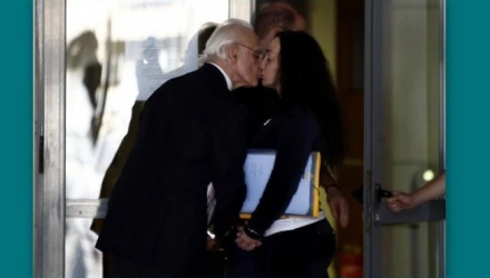 Ο Άκης Τσοχατζόπουλος μόλις είδε τη Βίκυ Σταμάτη έσκυψε, έκλεισε τα μάτια και τη φίλησε στο στόμα . Μπορεί το ζευγάρι να φοράει χειροπέδες, όμως αυτό δε το εμπόδισε να ανταλλάξει ένα τρυφερό φιλί έξω από το Πενταμελές Εφετείο Κακουργημάτων που δικάζει την υπόθεση του Άκη Τσοχατζόπουλου.