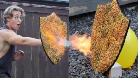 Ο influencer μόλις κατάλαβε τις ιδιότητες της φλούδας του ανανά αποφάσισε να φτιάξει μια ασπίδα, γεμάτη από φλούδες. Μόλις κατάφερε να φτιάξει την ασπίδα, έβαλε έναν φίλο του να τον στοχεύσει με ένα φλογοβόλο, για να δει αν τελικά αυτό που κατασκεύασε είναι λειτουργικό.