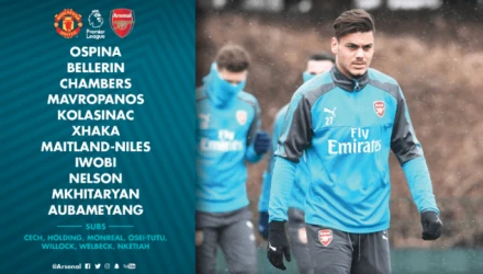 O Κωνσταντίνος Μαυροπάνος κάνει ντεμπούτο με τη φανέλα της Άρσεναλ, αφού ο Αρσέν Βενγκέρ τον συμπεριέλαβε στην αρχική ενδεκάδα για το ντέρμπι με τη Μάντσεστερ Γιουνάιτεντ.