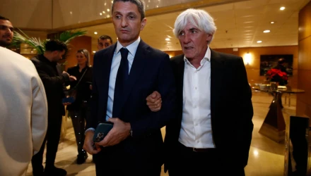 Η έλευση του Ραζβάν Λουτσέσκου με τον Ιβάν Γιοβάνοβιτς στην εκδήλωση, με τον ομοσπονδιακό τεχνικό να έχει αγκαζέ τον προπονητή του ΠΑΟΚ.