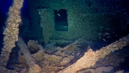 Εντοπίστηκε μικρό κάθετο ρήγμα στην αριστερή πλευρά. Διακρίνονται εγκάρσιοι και διαμήκεις νομείς, που φέρουν τρύπες καρφώματος της λαμαρίνας. Στην κάτω πλευρά της πρύμνης ένα δίχτυ ανεμότρατας έχει καλύψει το πηδάλιο και την προπέλα. Στην αριστερή πλευρά των υπερκατασκευών διακρίνεται η μοναδική ανοιχτή πόρτα του ναυαγίου στο μεσοστέγο (περί το μέσον του πλοίου). Τα συντρίμμια στο κατάστρωμα και οι στρεβλώσεις βοηθητικών υποστυλώσεων στις υπερκατασκευές δείχνουν μετακίνηση προς τα αριστερά», εξήγησε.